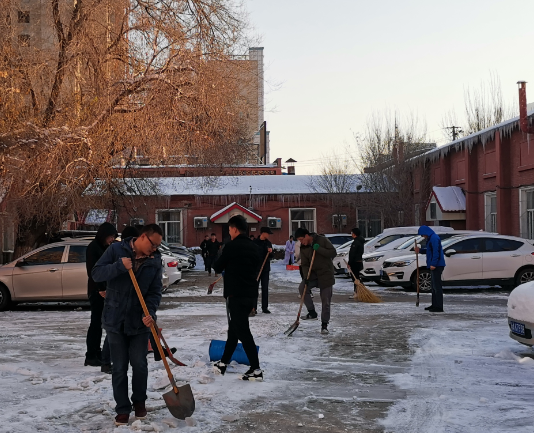 經(jīng)過一個多小時的奮戰(zhàn),大家將院內(nèi)積雪全部清掃干凈。雖然弄濕了鞋子,弄臟了衣服,但是看著為客戶開辟的這條通暢之路,每個人臉上洋溢著自豪的笑容。